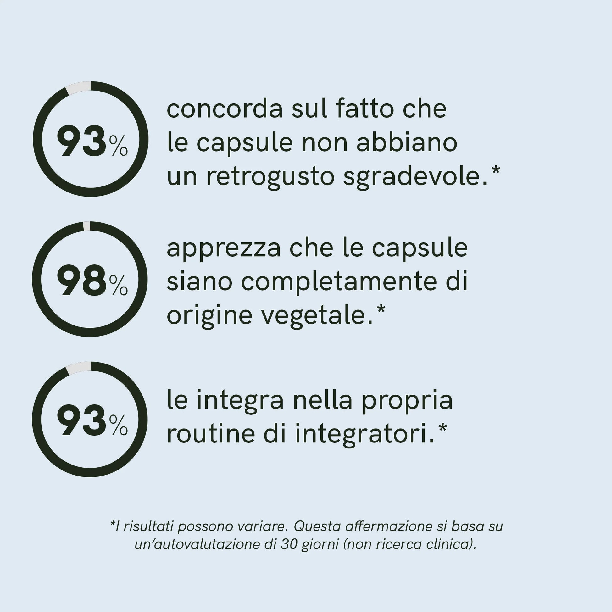 Le capsule sono prodotte nell’UE, prive di glutine, senza olio di palma, vegane e testate in laboratorio. Stabilizzate con estratti naturali di tocoferolo e rosmarino per garantire la massima purezza e qualità.