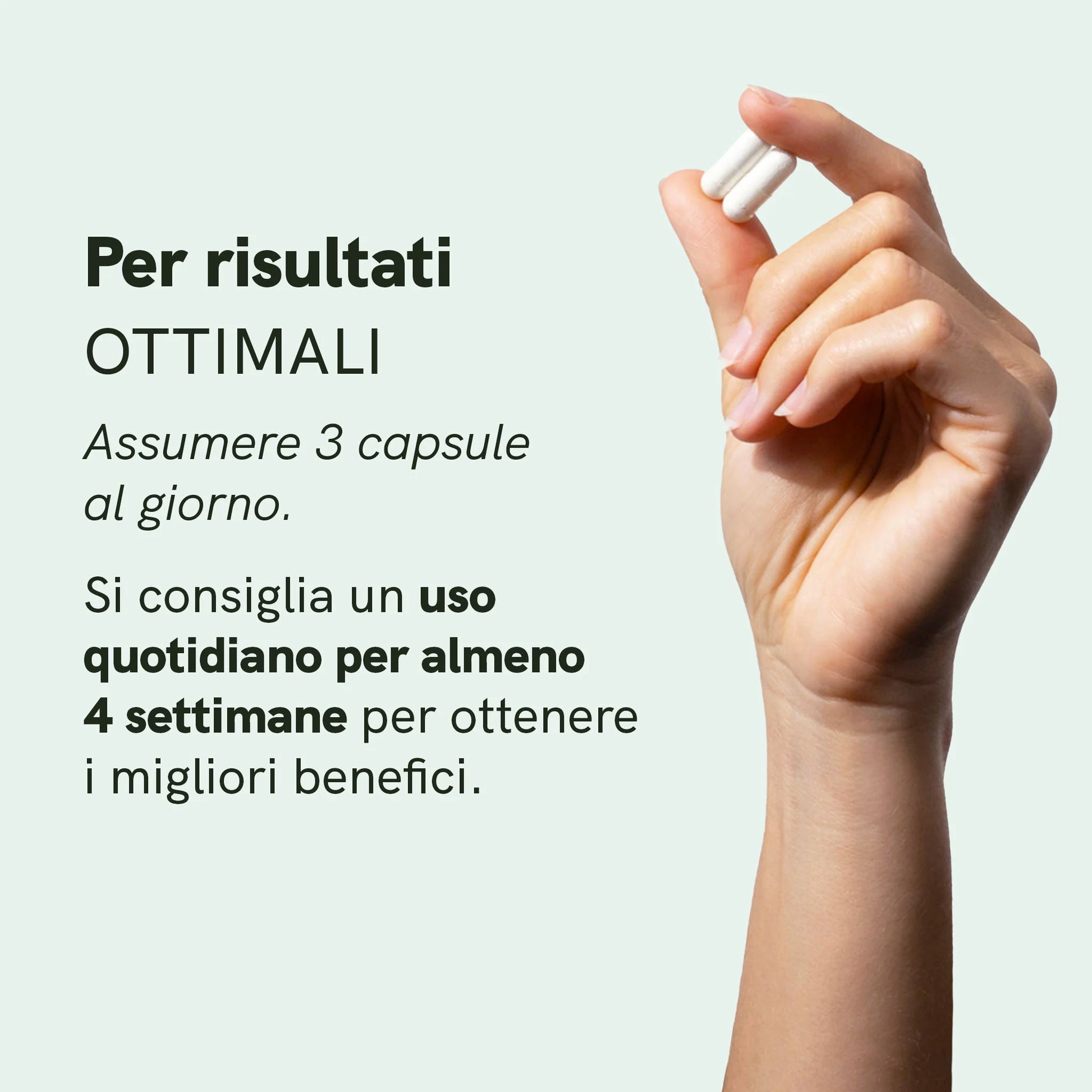 Si consiglia di assumere 3 capsule al giorno, preferibilmente durante i pasti, salvo diversa indicazione del medico. Non superare la dose giornaliera raccomandata. Questo prodotto non è adatto ai bambini. Consultare il medico prima dell'uso in caso di gravidanza, allattamento, malattia o assunzione di farmaci. Questo prodotto non sostituisce una dieta sana ed equilibrata.