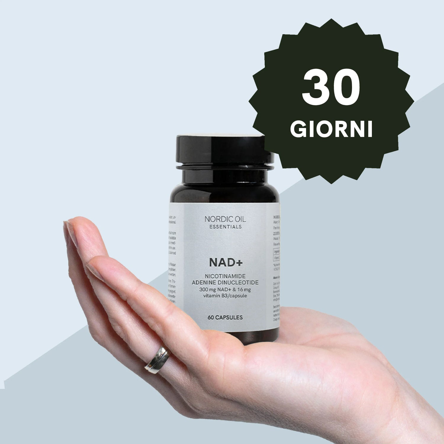 Le capsule di Nicotinamide Adenina Dinucleotide (NAD+) di Nordic Oil uniscono due componenti potenti: 300 mg di NAD+ e 16 mg di nicotinamide (vitamina B3) per capsula.