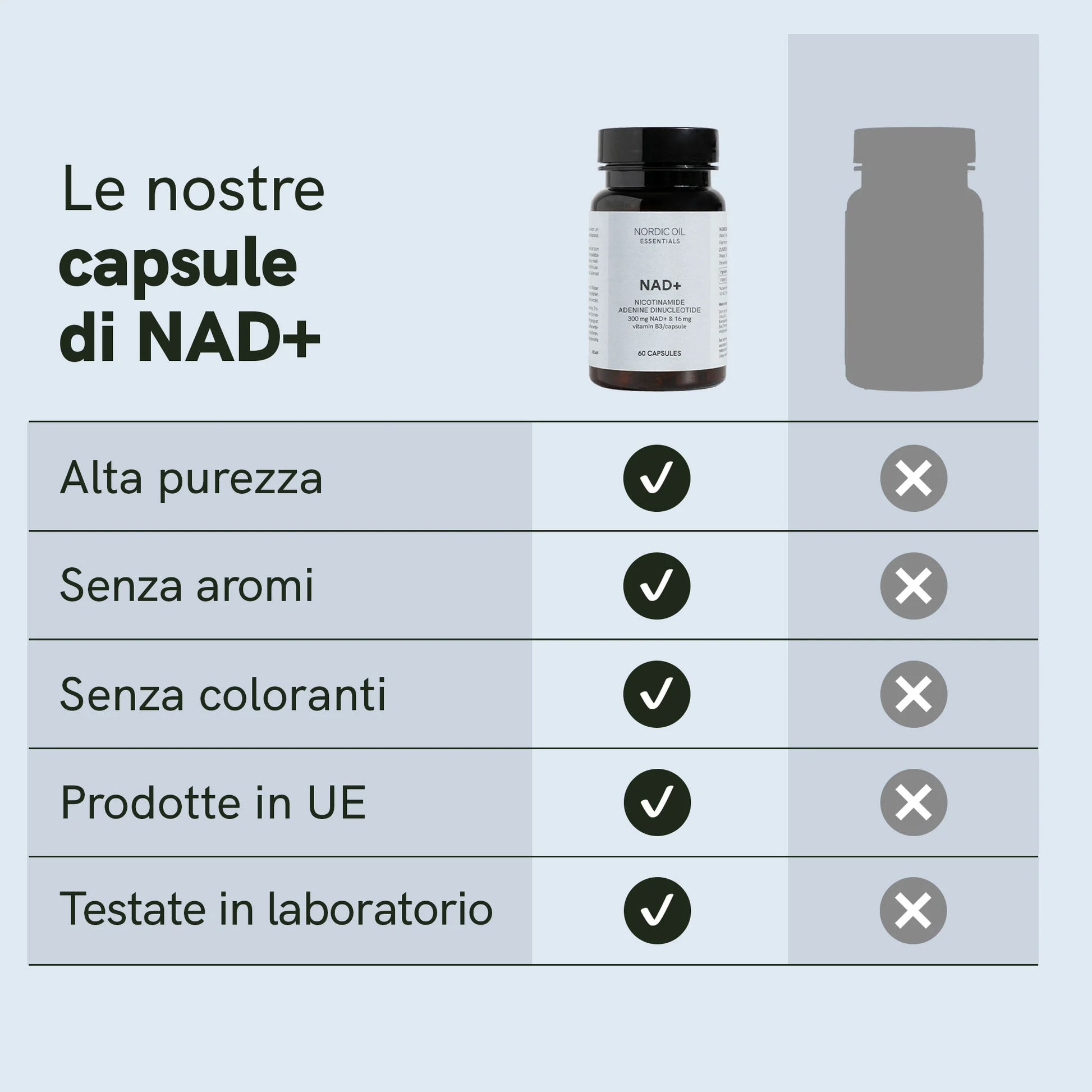 - Formula ad alta concentrazione: 300 mg di NAD+ e 16 mg di Vitamina B3 per capsula