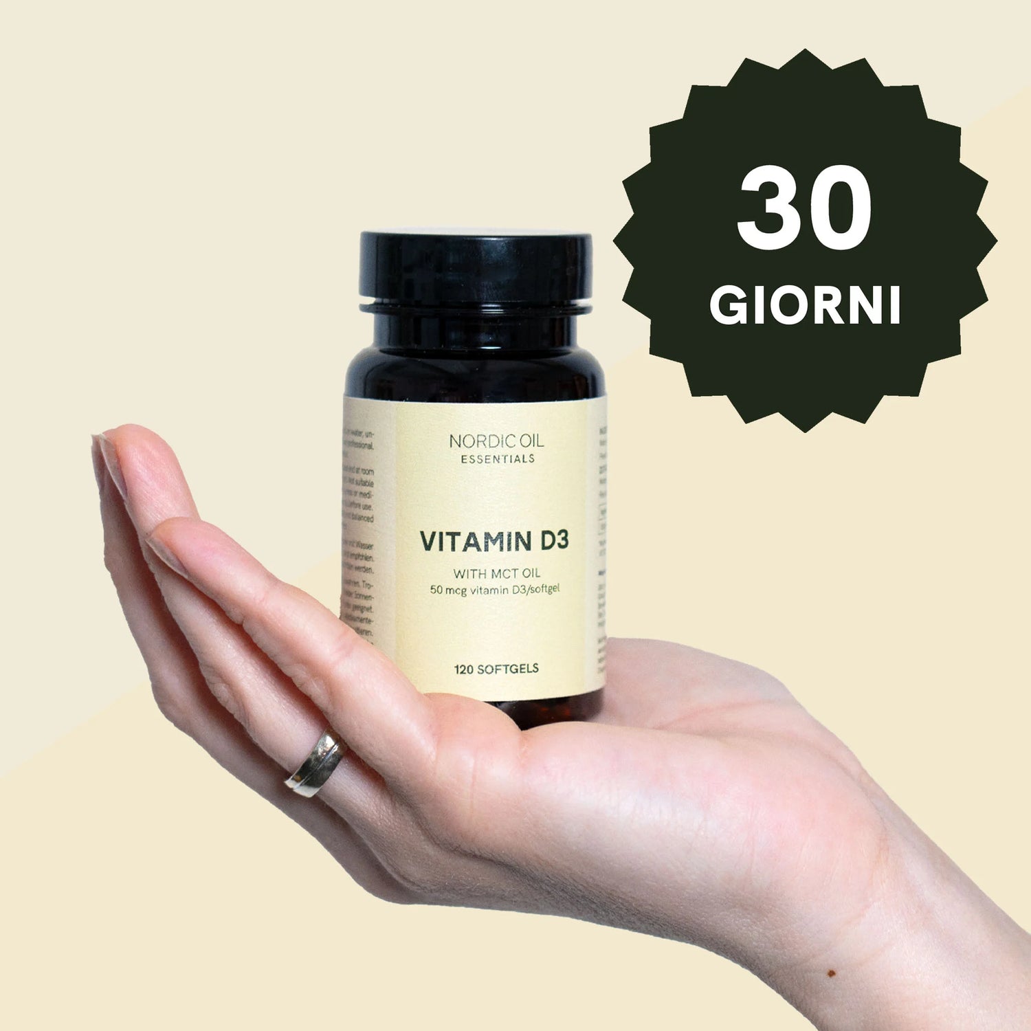 Le capsule di vitamina D3 di Nordic Oil sono un supplemento alimentare di alta qualità studiato per sostenere le funzioni di ossa, denti, muscoli e difese immunitarie. Ogni confezione contiene 120 capsule softgel, sufficienti per quattro mesi. Una singola capsula softgel fornisce 50 mcg di vitamina D3, pari al 1000% del valore nutritivo di riferimento (NRV). Queste capsule di vitamina D3 sono vegane, prodotte nell'UE e rigorosamente testate in laboratorio per garantire la massima qualità. Sono prive di aromi e coloranti artificiali e utilizzano olio MCT dalle noci di cocco per un maggiore assorbimento. Questo prodotto è ideale per chiunque voglia assicurarsi in modo semplice ed efficace l'apporto quotidiano di vitamina D.