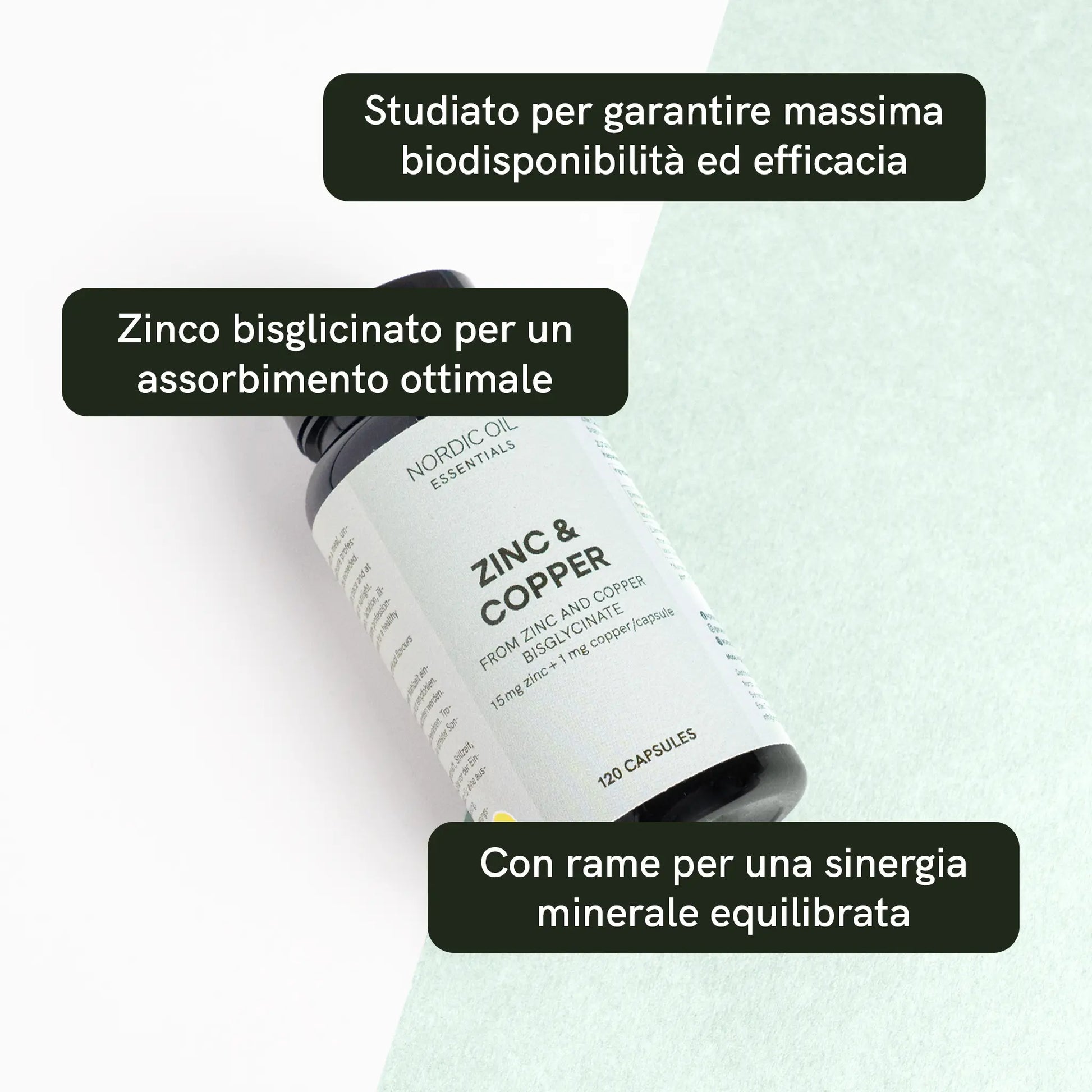 Lo zinco e il rame lavorano insieme per mantenere un sano equilibrio nell'organismo. Mentre lo zinco supporta il sistema immunitario, la guarigione delle ferite e la salute della pelle, il rame svolge un ruolo nella formazione dei globuli rossi e nell'assorbimento del ferro. In combinazione, zinco e rame assicurano un assorbimento e una funzionalità ottimali dei rispettivi minerali, poiché una quantità eccessiva di zinco può compromettere l'assorbimento del rame. Questo equilibrio favorisce una migliore salute generale, tra cui la funzione immunitaria, la produzione di energia e la salute della pelle.