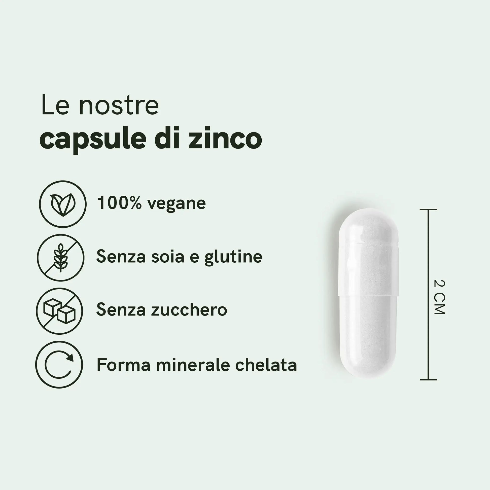 Lo zinco è un minerale essenziale che svolge un ruolo importante in molte funzioni corporee. L'assunzione di capsule di zinco può supportare il sistema immunitario, favorire la salute della pelle e contribuire alla normale funzione cognitiva. Lo zinco favorisce anche la guarigione delle ferite, la produzione di ormoni e la salute di capelli, pelle e unghie. L'assunzione regolare di zinco può favorire la salute e il benessere generale.