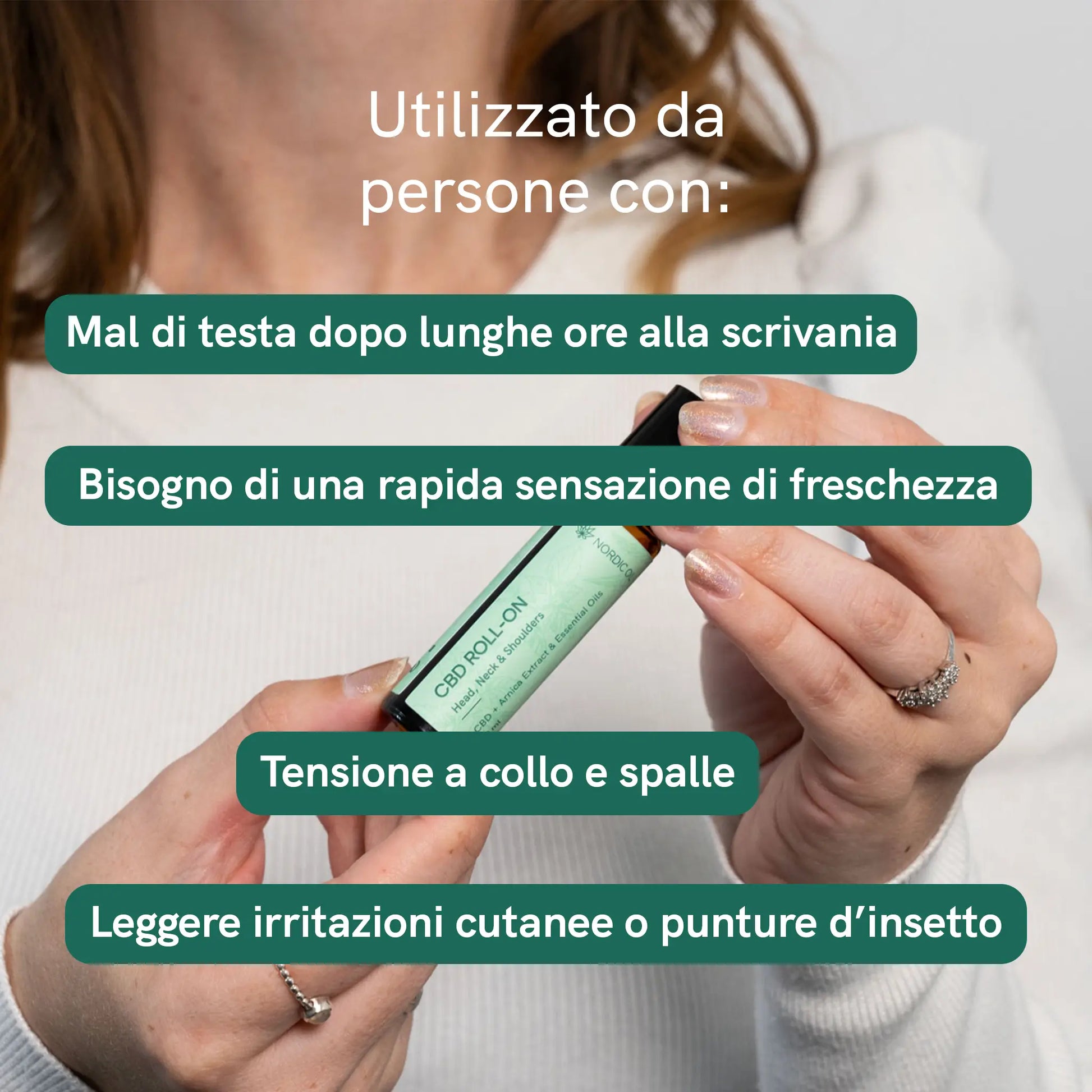 CBD Roll-On è stato sviluppato appositamente per le persone che cercano un supporto mirato contro la tensione muscolare e i dolori articolari. Grazie ai suoi ingredienti naturali, il prodotto è adatto anche alla cura della pelle sensibile, ad esempio dopo punture di insetti. Il roll-on al CBD è particolarmente consigliato a chi soffre spesso di mal di testa, ai professionisti con lavori prevalentemente sedentari, agli anziani e a chiunque sia soggetto a tensione muscolare. Molti utenti integrano il roll-on nella loro routine quotidiana per prendersi cura e rilassare in modo mirato determinate zone.