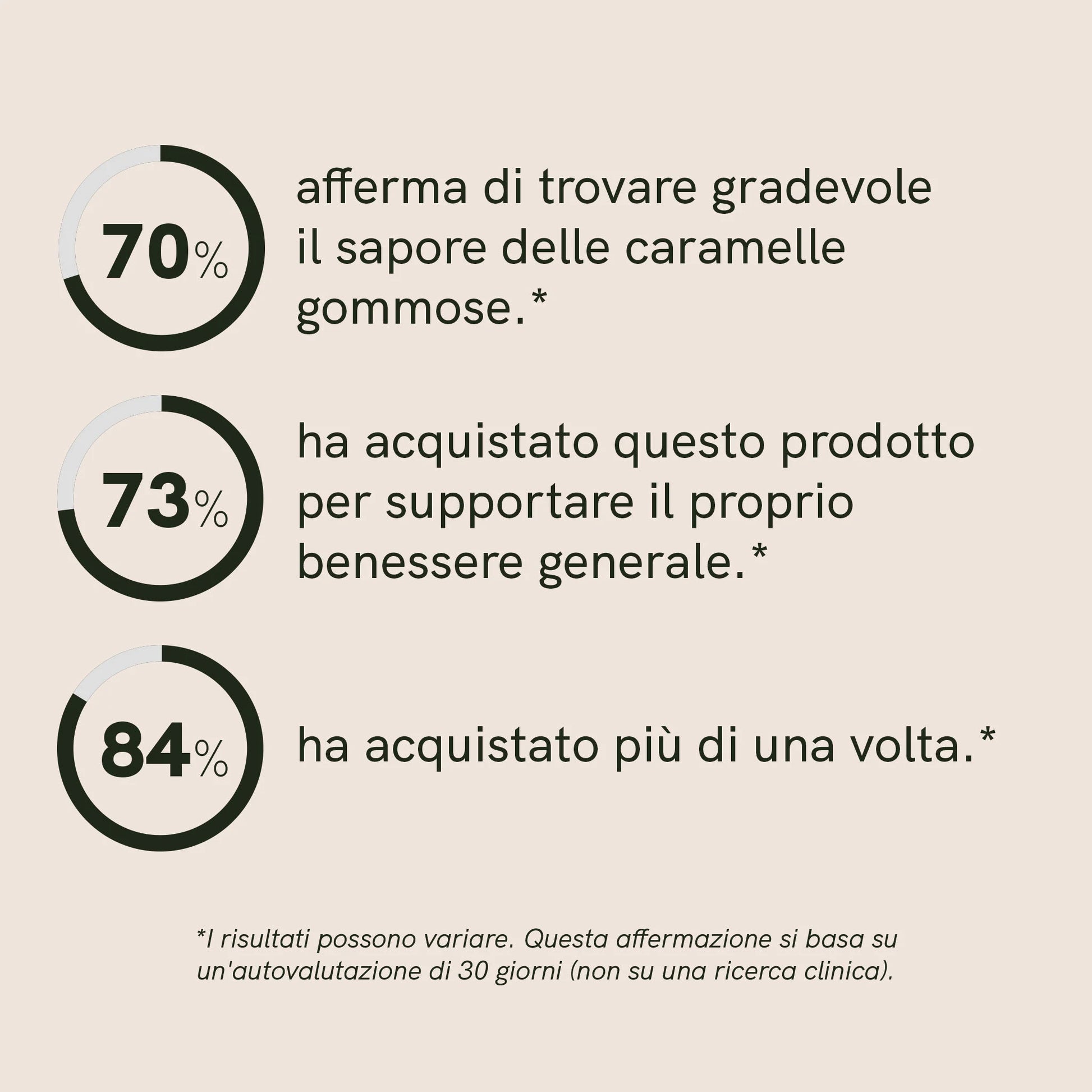 Ogni carammellina gommosa contiene 200 mg di estratto di funghi medicinali biologici, combinando supporto immunitario, proprietà antiossidanti e miglioramento cognitivo per promuovere la longevità e un invecchiamento sano.*