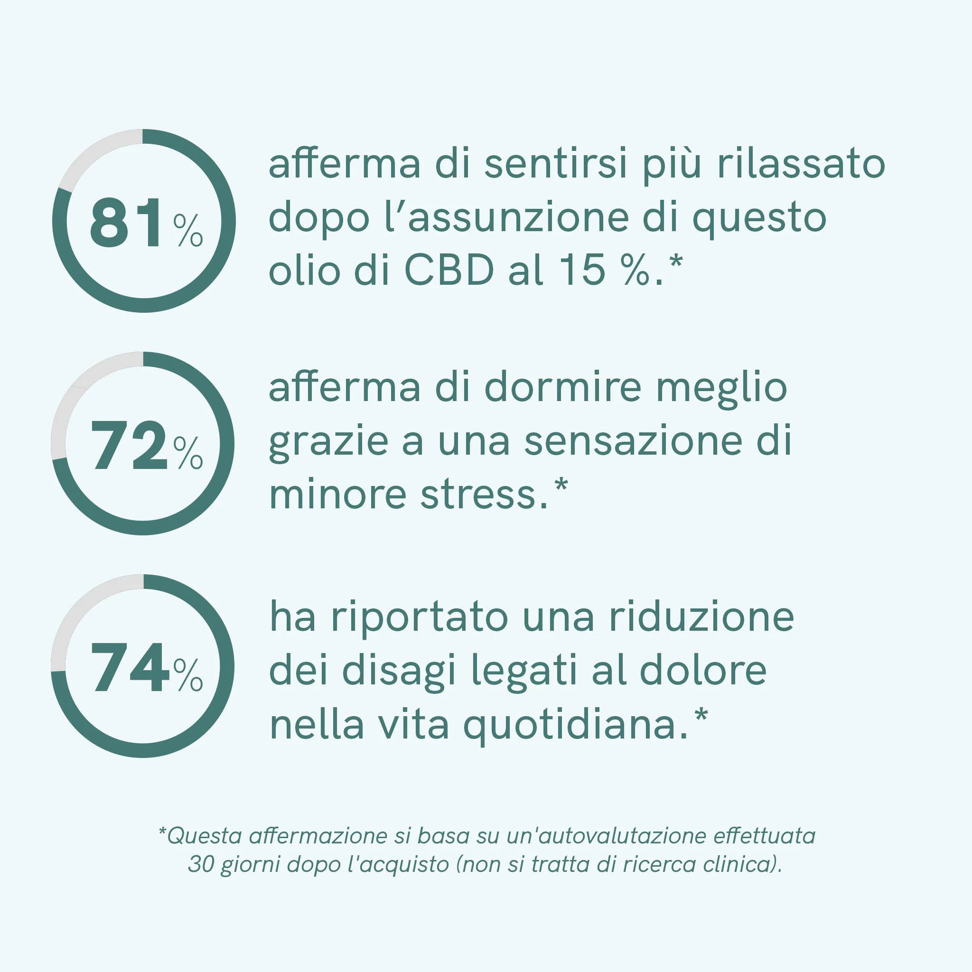 Un olio di CBD al 15% contiene 1500 mg di CBD in un flacone da 10 ml. La percentuale indica la concentrazione di cannabidiolo presente nel prodotto: più alta è la percentuale, maggiore è la quantità di CBD in ogni goccia. L’olio al 15% è ideale per chi desidera un effetto più intenso ed è già abituato a utilizzare prodotti a base di CBD.